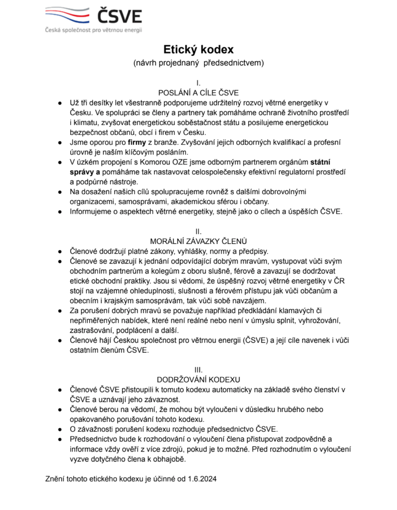 Vedle větrného desatera (pdf), ve kterém zastupitelé obcí najdou rady, jak postupovat v jednáních se zástupci větrné energetiky, jde o druhý dokument, jehož cílem je udržet vysoký standard práce investorů ve větrné energetice. Kodex je platný od 1. června a je dostupný zde.