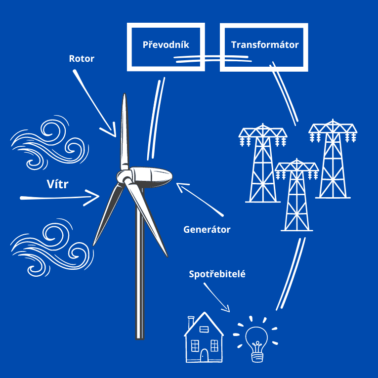 Větrná elektrárna funguje na principu přeměny kinetické energie větru na elektrickou energii. Vítr roztáčí lopatky turbíny, které jsou připojené k rotoru. Rotor převádí mechanickou energii na hřídel, která otáčí generátorem. Generátor pak vyrábí elektřinu. Po generátoru je ještě převodník a transformátor, které upravují napětí předtím, než elektřina putuje do sítě a ke spotřebitelům. Moderní větrné turbíny mají systém pro natáčení lopatek podle směru větru a regulaci otáček, což maximalizuje efektivitu výroby elektřiny i při proměnlivých podmínkách.